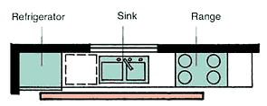 1- اعتماد الخط المستقيم في المطابخ التي لا يتجاوز عرضها( 1,60م ) بحيث يكون الأثاث موزعاً كله على جدار واحد و بالتالي لن يحتاج لمثلث عمل لصغر حجمه عادة .