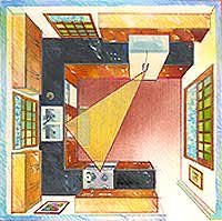 ويكون الحوض في أقرب مكان للإضاءة أو الشباك، أما الموقد ففي أقرب مكان لمصدر التهوية.