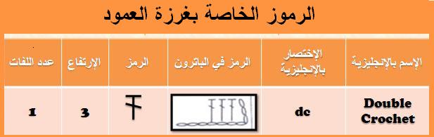عرفت رمز غرزة العمود بلفتين والحشو والسلسلة وفي غرزة ماعرفت المقصود فيها الغرزة اللي مستخدمه فوق السلاسل ورمزها عباره عن خط مستقيم زي حرف ال I بالانجليزي