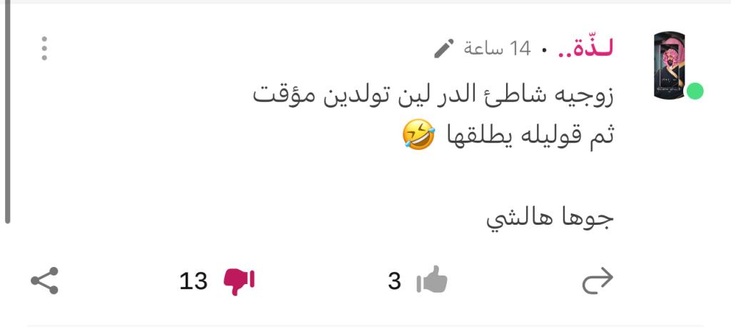 اسمعي ي بنت الناس خلينا نسفها ترانا والله لقيناها وجه زياده ع اللزوم هذي فاضيه مره انا مستغربة حتى اغراض للعيد ماتنزل تقضي ولاتطلب امانه ياامطار اوعديني نطنشها المثل يقول لاتعطي البزر وجه يوريك حمار……. 🤣🤣🤣🤣🤣🤣🤣 وربي انقرفت منها فيها نوع من الشذوذ الاخلاقي احس اني استحقر نفسي لاتناقشت معاها تكفين ان كان لي معزه خلينا نتعداها ونشقق صفحتها وتبربر مع نفسهااسمعي ي بنت الناس خلينا نسفها ترانا والله لقيناها وجه زياده ع اللزوم هذي فاضيه مره انا مستغربة...