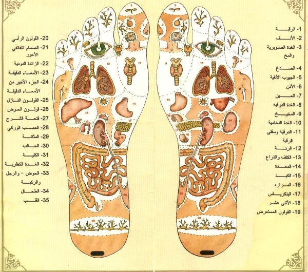 شوفيي هنا عندك صورة توضح خارطة الجسم من خلال القدم منطقة الكوي سبحان الله هي منطقة المعدة و الامعاء ..