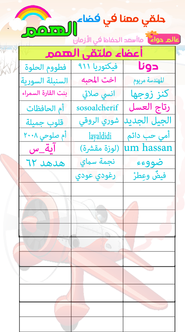 << لايوجد لدينا تسميع .. هنا مقطع تجدين فيه افكار للمراجعة بدون مسمع وإن رغبتِ في ان يتم التسميع لك جربي التسجيل في موقع طريق الحقيقة علما بانه ليس للموقع اي صلة بالحلقة لك أن تختاري الجدول الذي يتناسب مع وقتك وقدرتك.. الجدول المقترح: حفظ وجه أونصف من الأحد إلى الأربعاء مع مراجعة وجهين أو 4 اوجه من حفظك القديم و مراجعة ماتم حفظه خلال الأسبوع يوم الجمعه إجازة ومراجعة آخر جزء تم حفظه يوم السبت الجدول ليس إجباري.. لك ان تختاري أي جدول أخر هذا رابط فيه جدول لحفظ القران نضعه للفائدة وستجدين في نهاية كتاب خير معين في حفظ القران الكريم مجموعة من الجداول المفيدة