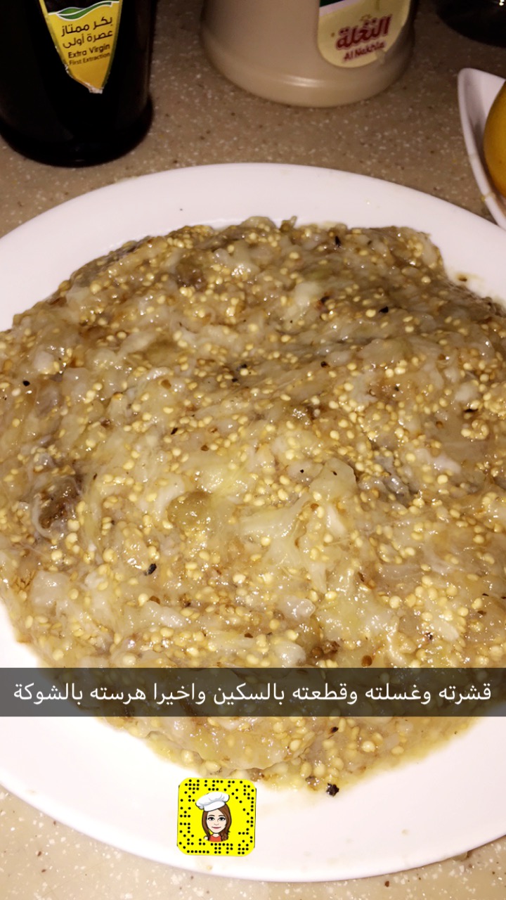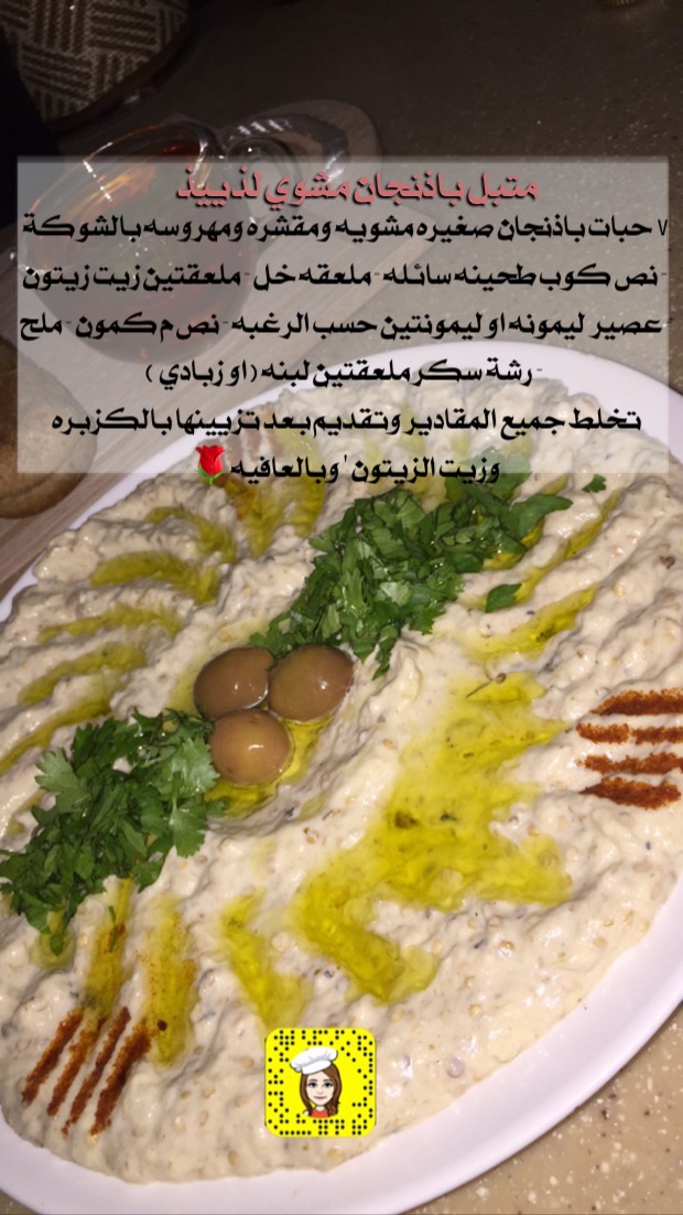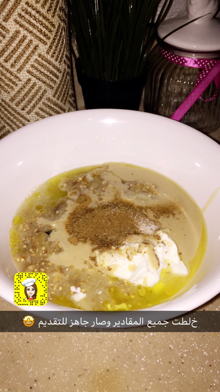 ٧ حبات باذنجان صغيره مشويه ومقشره ومهروسه بالشوكة - نص كوب طحينه سائله - ملعقه خل - ملعقتين زيت زيتون - عصير ليمونه او ليمونتين حسب الرغبه - نص م كمون - ملح - رشة سكر ملعقتين لبنه ( او زبادي )