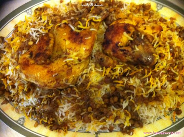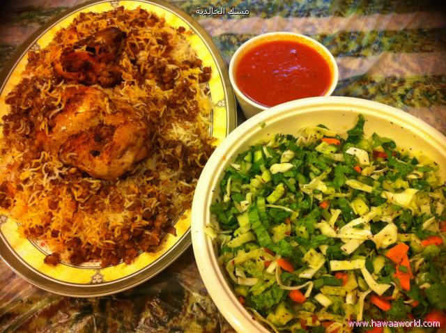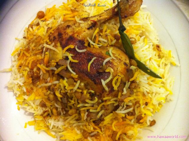 وبعد ان استوى الدجاج اخرجه من الماء واصفي الماء ( المروق ) من البهارات و البصل وادهن الدجاج بقليل من الزيت و قليل جدا من المعجون و خلطة التالية وهي ماء ورد وهيل ناعم و زعفران وصبغ الرز البرتقالي