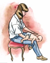 الصغير يوضع على رجل المسعف مع وضع اليد اسفل الصغير وامالت الراس الى الاسفل مع الظرب على ظهره