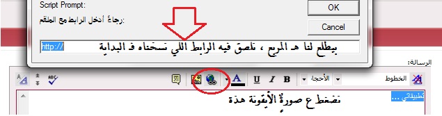 ونضغط ع صورة الكورة الأرضية الموضحة ونلصق الرابط اللي نسخناه في خانة الرابط ( طبعاً بعد ما نمسح كلمة http\\ )