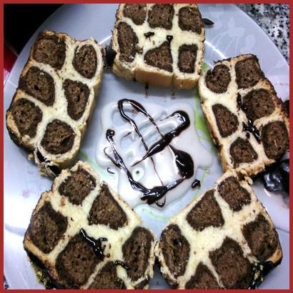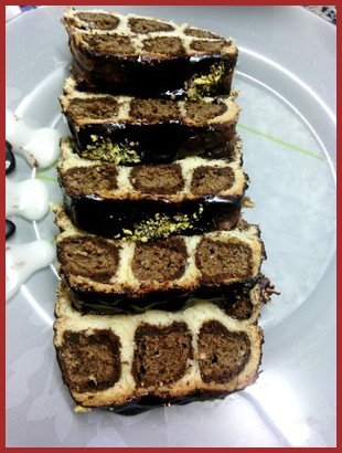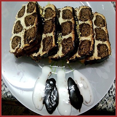 نلفها البنية الداكنة داخل البنية الفاتحةثم فوقهم العجينة البيضاء و يصبح عندنا اعمدة نرها في مستطيلو تخمر نصف ساعة أخرى و تخبز