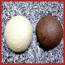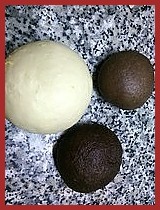 واحد نلونه بككاو عادي و الاخر بككاو اسود نقسم كل العجينات الثلاث الى ٦ قطع صغيرة