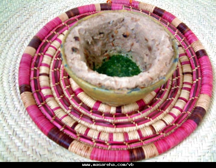 يسحق شي من الفلفل الحار اي البسباس على حجر خصص لهذا الغرض يسمى مسحقة او مطحنه ويضاف له لبن رائب تسمى حقنه وتتناول مع الخبز الحامض 00الخمير 00