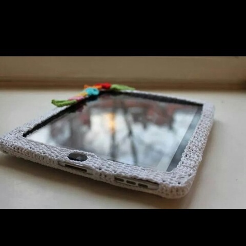 The cozy is filet crocheted in white with some effect ?blobs? in bright colors. And a Apple inc. ?apple? in yellow on the back where the apple is placed on the Ipad. I added some crocheted flowers and leafs as well.