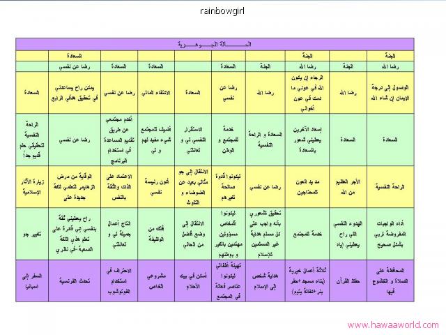 هذه الدراسة أجريت علي الأمريكان ، وربما يكون المعني لبعض الكلمات غير واضح كما وجدت من بعض أسئلة الأخوات ( إذا كنت تجيدين الإنجليزية ربما يكون المعني بالإنجليزية أقرب لك من الترجمة ) ، ما أريد قوله هو أنه ليس من المهم أن تتقيدي بهذه الحالات أو تفهميها حتي تصلي إليها ، ولا أدعي تخصصي بهذا الأمر ، ولكن من خلال تأديتي للتمرين عندما أصل للحالة الجوهرية تحسين بها وتشعرين بنفسك فيها ، تحسين بشعور ربما يكون غير قابل للوصف بالكلمات المجرد ، أحاسيس ........