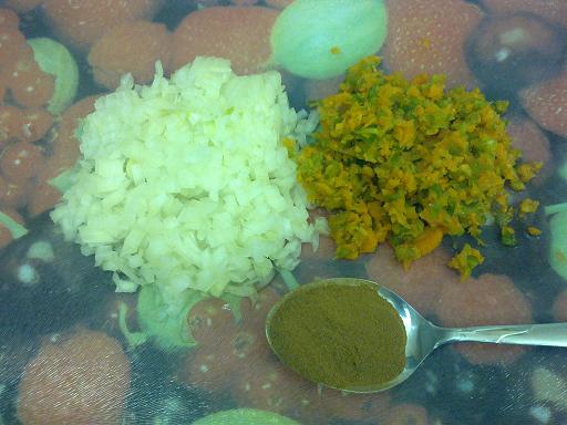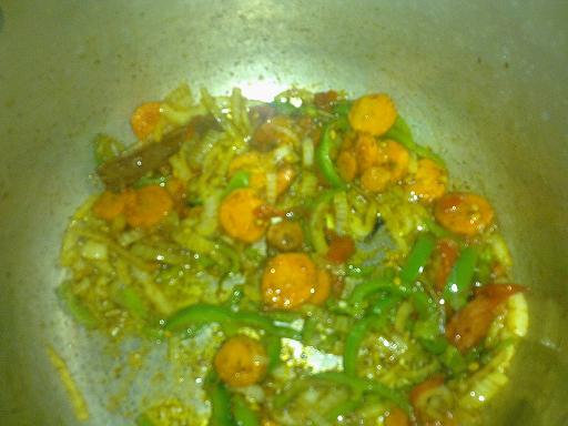 نجهز كشنة الرز وهي عباره عن بصله مفرومه ناعم -نصف حبه فلفل رومي مفروم في فرامة البصل مع حبة جزره متوسطه -ملعقه كبيره قرفه مطحونه ناااعم