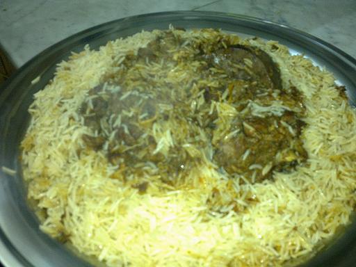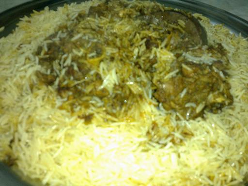 بعدكذا اضيفي الرز اللي مطبوخ نص طبخه فوق اللحم بدون تحريك اذا كان الرز ناشف اضيفي شوية مويه اما اذا كان لسا فيه مويه خلاص تكفي وغطي القدر خفضي النار بالمره واتركيه عشر دقائق ثم اقلبيه في الصحن وزينيه بطريقتك وهذي الصوره بس والله ظالمه الطبخه في الطبيعه تهبل ويكفيك ريحتها الحلوه
