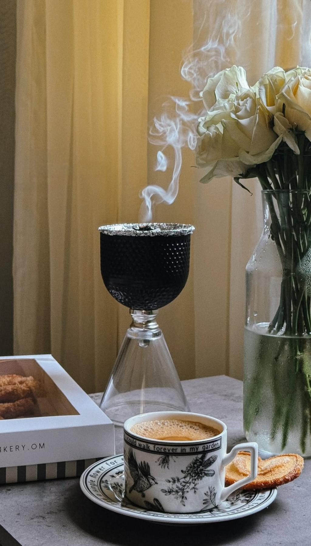 وأحرص أن أشرب الماء💙 ثم بعده الشاي☕️ حيث تبدأ الصباحات❤️ وبعدها أبدأ الحياة💚 ...وبعد أن أشرب الكوب الثاني من الشاي وسط اليوم أبدأ زمنًا آخر من اللذة☕️😍❤️🌹...أما القهوة☕️🤍 هي فتنة هذا الزمن😋 وهي محرك الحياة التي تبثها الحيوية وتمنحها الحركة التي تليق بها وأحب رائحتها وشربها أكثر في المناسبات أو الزيارات أو في المقاهي مع زوجي❤️ وأهلي💚 وصديقاتي🤍...
