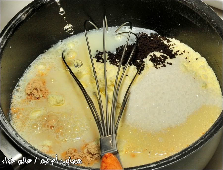 ونستمر في الخلط ( نضيف الماء حسب الرغبة فالبعض يريد الخليط سائل جداً والبعض يريده متماسك )