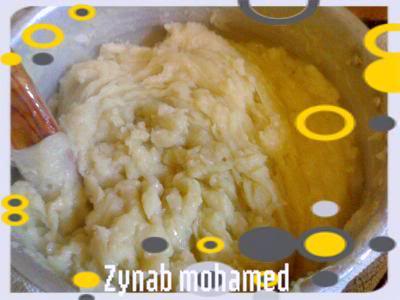 و يتم مزج العجينة و تعصديها بواسطة المغرف لعدة دقائق.