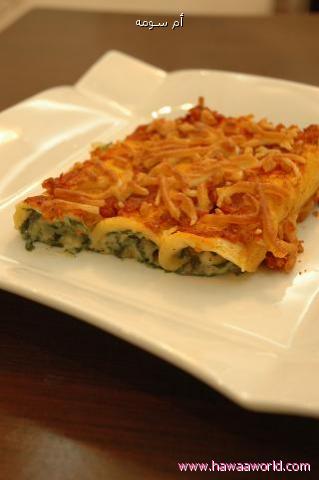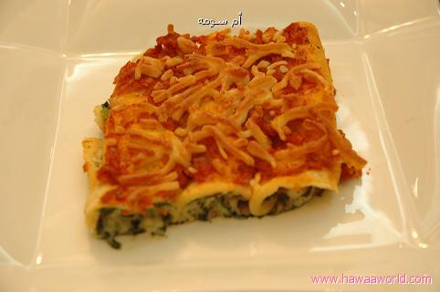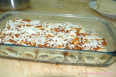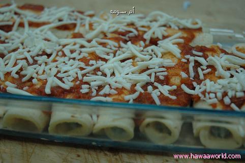 ثم نرصها بصينيه الى أن تنتهي ثم نضع عليها الصوص ونرشها بالجبنه الموتزريلا ..