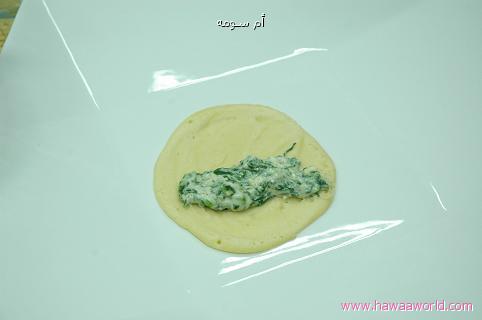 نأخد كل حبة ونحشيها بخلطة السبانخ إلى أن ننتهي من الكمية.