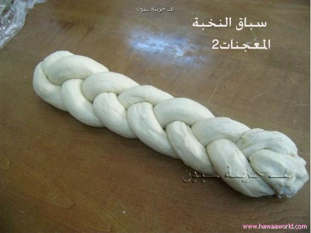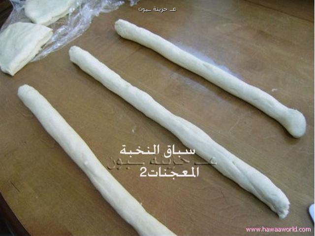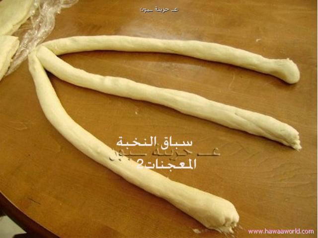 نستخدم 3 أقسام من العجين لعمل الجديلة وقسمين لعمل المبرومة