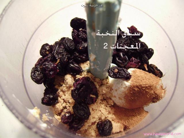 2/1 كوب زبيب أسود منقوع في ماء حار ربع ساعة ومصفى ومجفف بورق مطبخ .