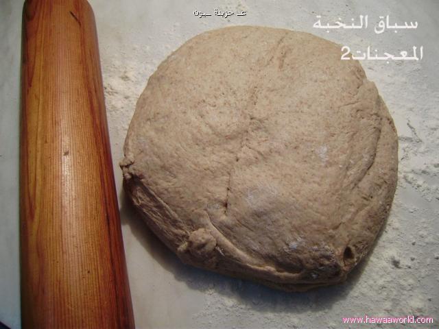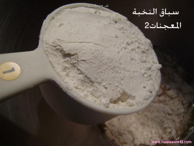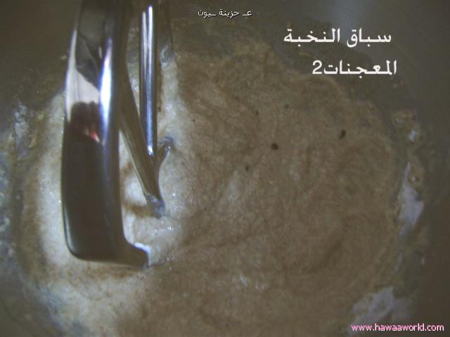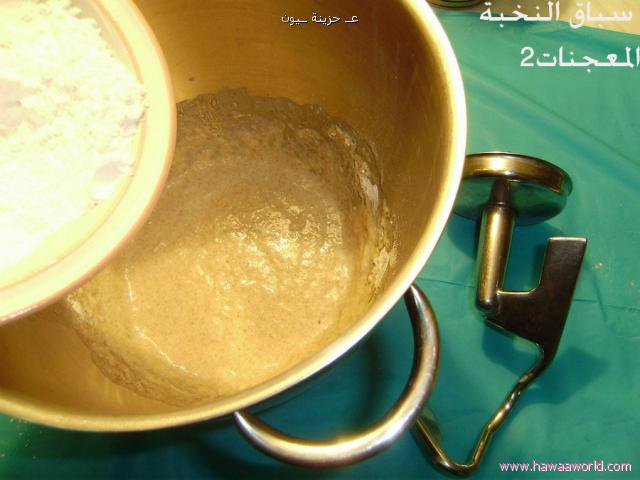 ثم نضيف باقي كمية الدقيق وبواسطة أداة العجن نعجن حتى يتكون لدينا عجينة ناعمة ولكن ليست طرية ( ممكن زيادة ماء دافيء حسب الحاجة إن كان العجين الناتج جاف وقاسي