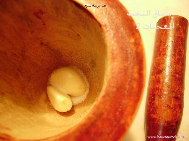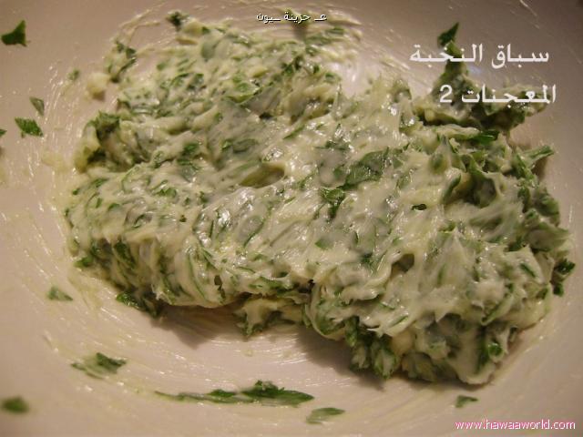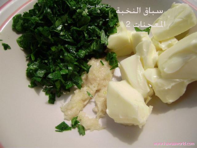 ندق الثوم مع ذرة الملح حتى ينهرس جيداً ثم يضاف للزبدة الطرية والبقدونس ويخلط جيداً