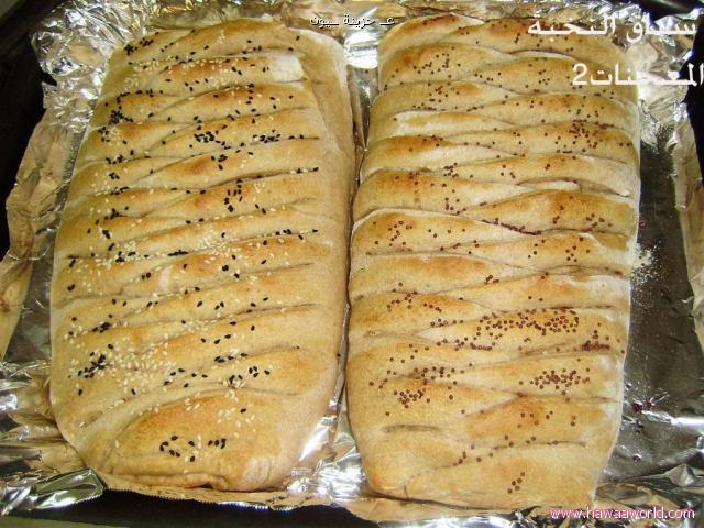 ندهن وجه الجديلتين بالبيض أو الحليب وننثر السمسم أوحبة البركة ونغطي الصينية ونتركها حتى يتضاعف حجم الجديليتن