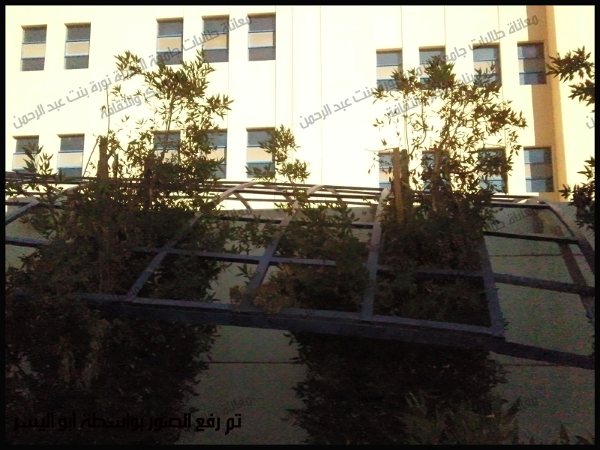 هذه صورة لمظلة زجاجية قد سقطت على الأشجار ويبدو أن الجامعة تنتظر سقوطها على أحد الطالبات لتقوم بعد ذلك بإزالتها