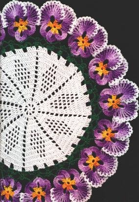 Repeat these 6 Pansies twice (18 in all). Tack tog. In order, by 3 lps on each side. Lap 2 top petals of each over edge of Center between points and sew in place on back.