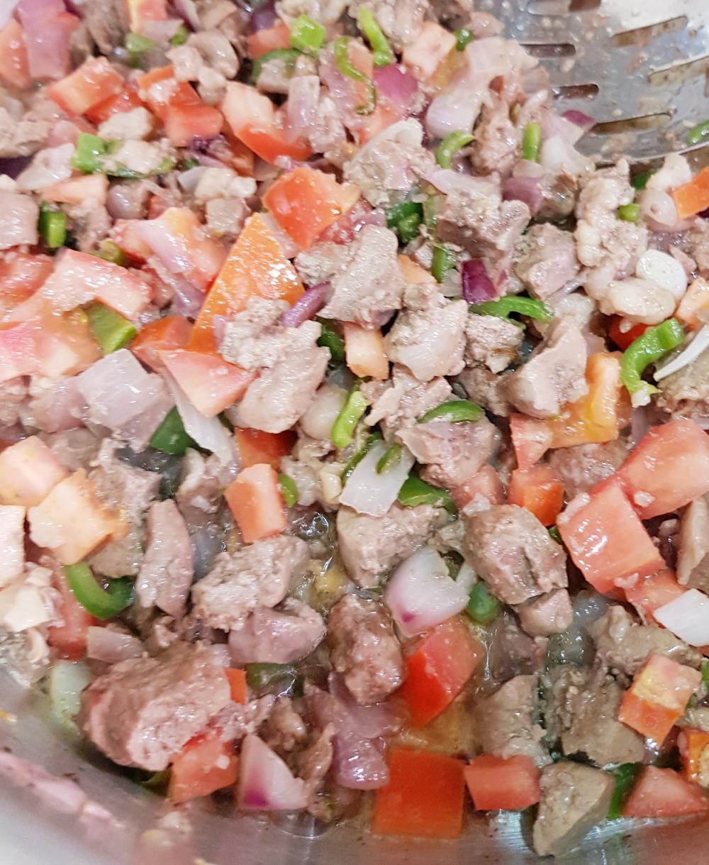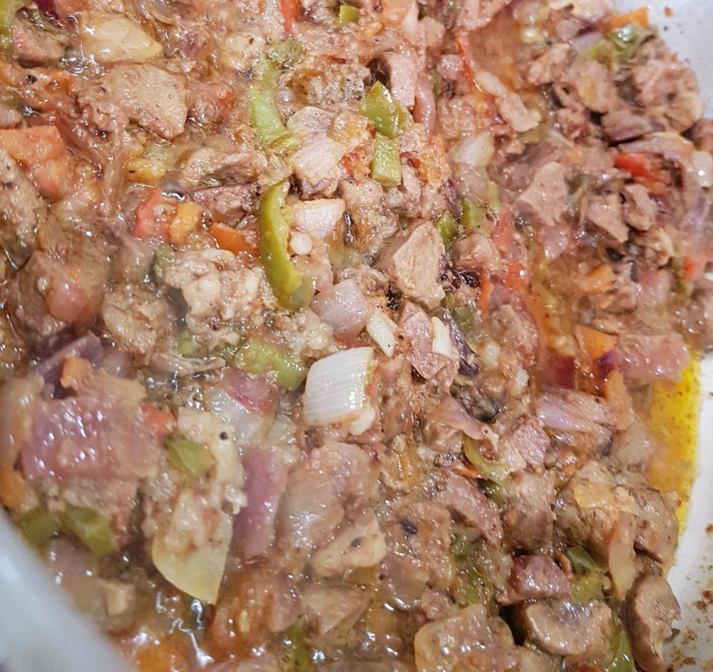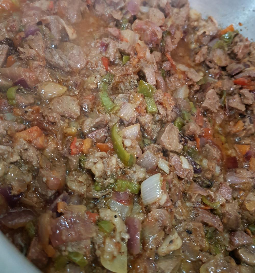طبخة اللحمه اشوي لحد ما نشفت مرقتها وبعدها حمسة بصل وفلفل لحالهم بشوي سمنه وبس شقرتهم حطيت الكبده وحمستها معاهم وحطيت فوقهم حبة طماطم وحركتهم اشوي وبس تسبكو اشوي حطيت ملح وفلفل اسود وباريكيو التوابل وغطيتهم دقايق لحد ما يتجانسو بعض