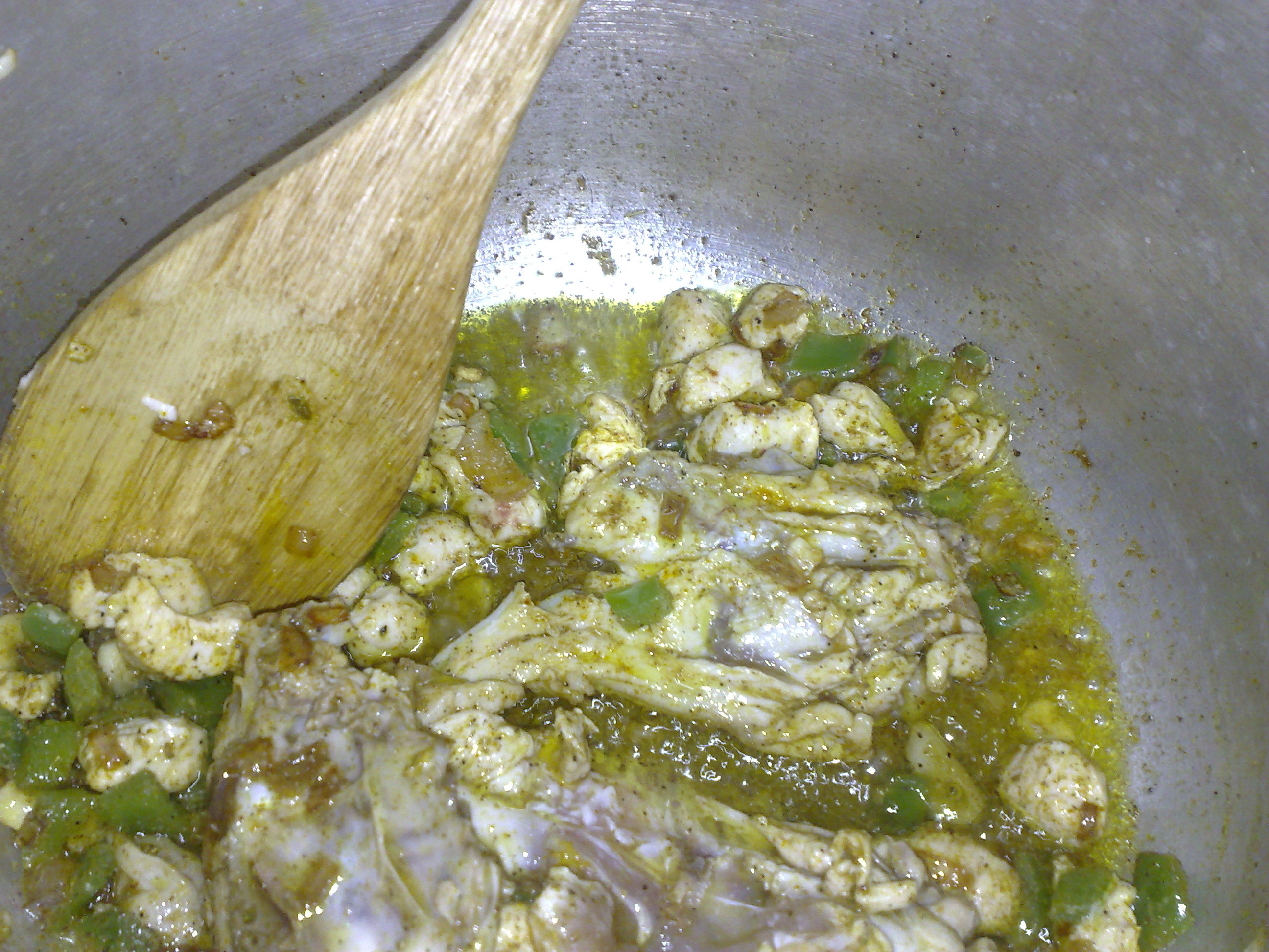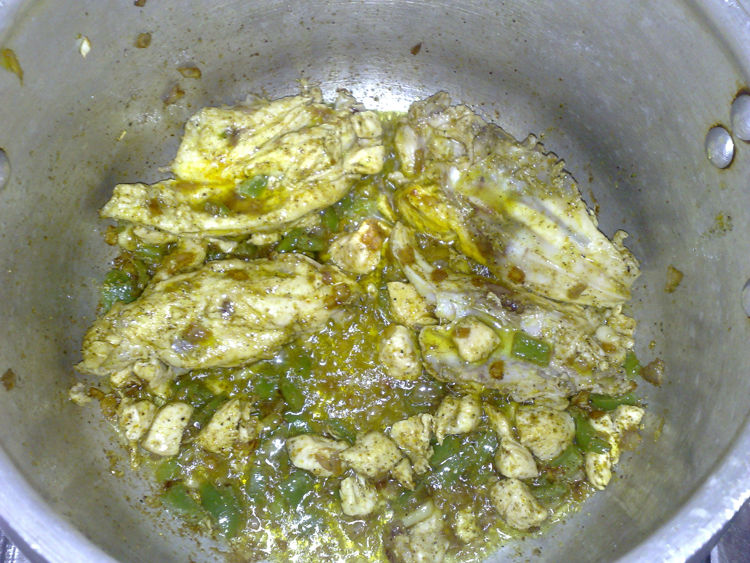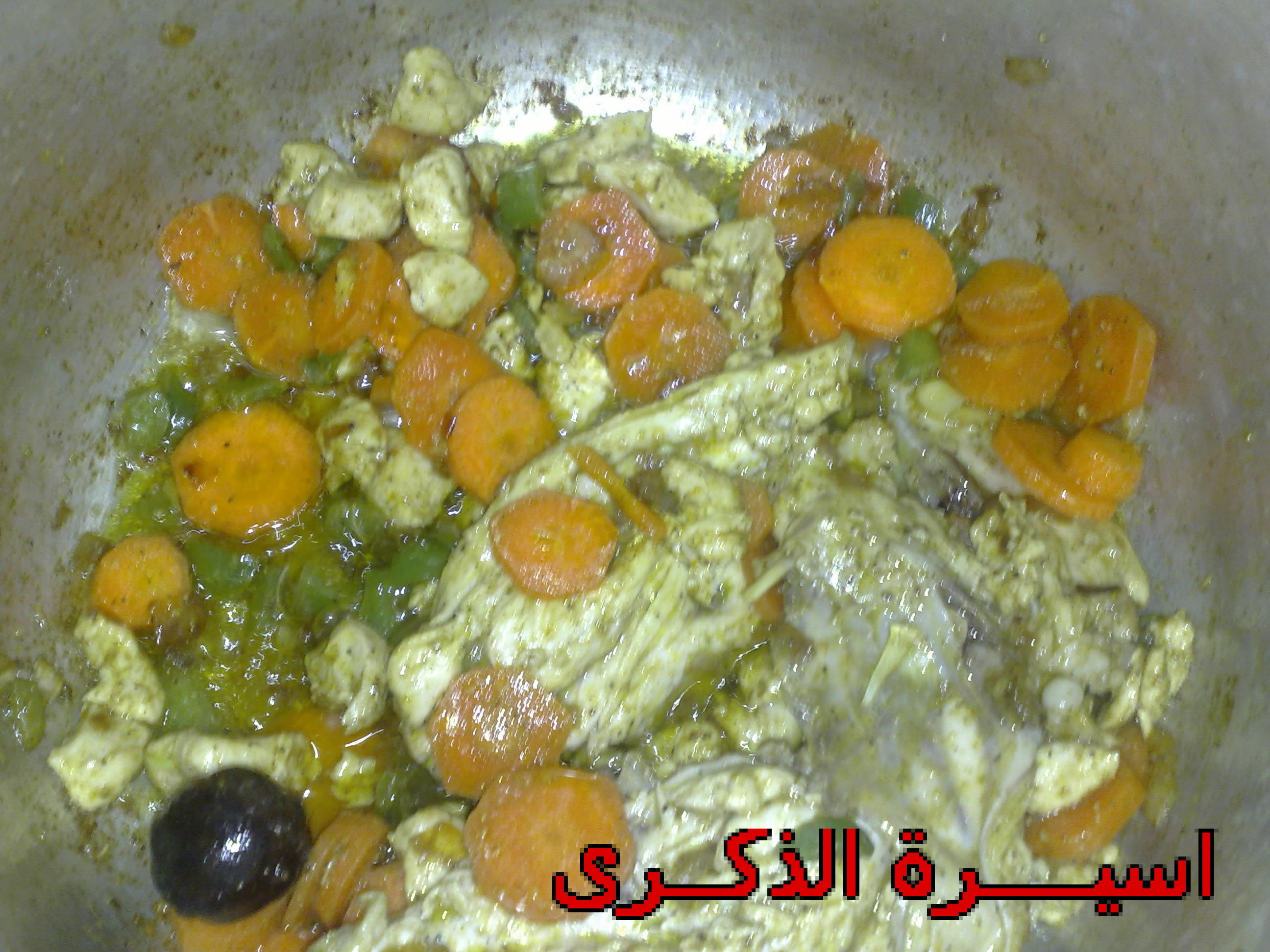 بعدها اضفت الدجاج المغسل والمقطع الجاهز عندي ...