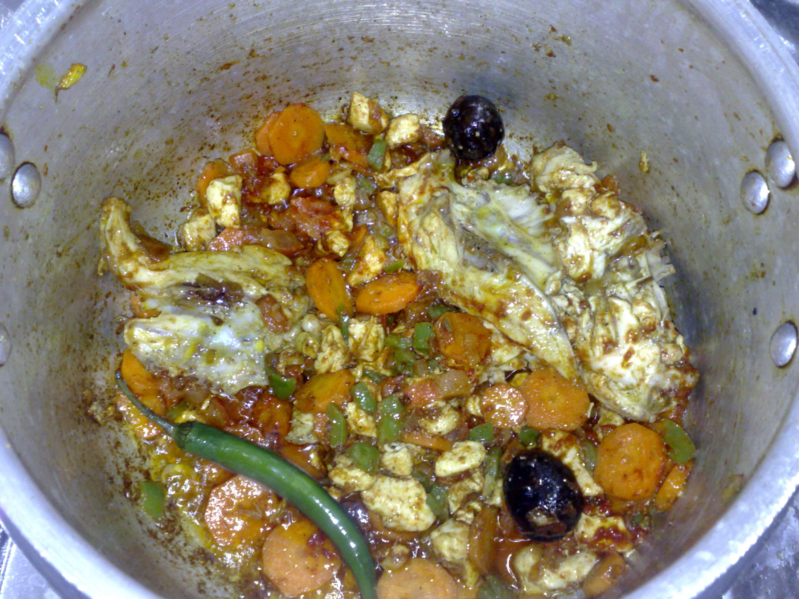 اضيف البهارات كامله ونقلبها شوي عشان الدجاج والخضار يمتصون النكهه ...