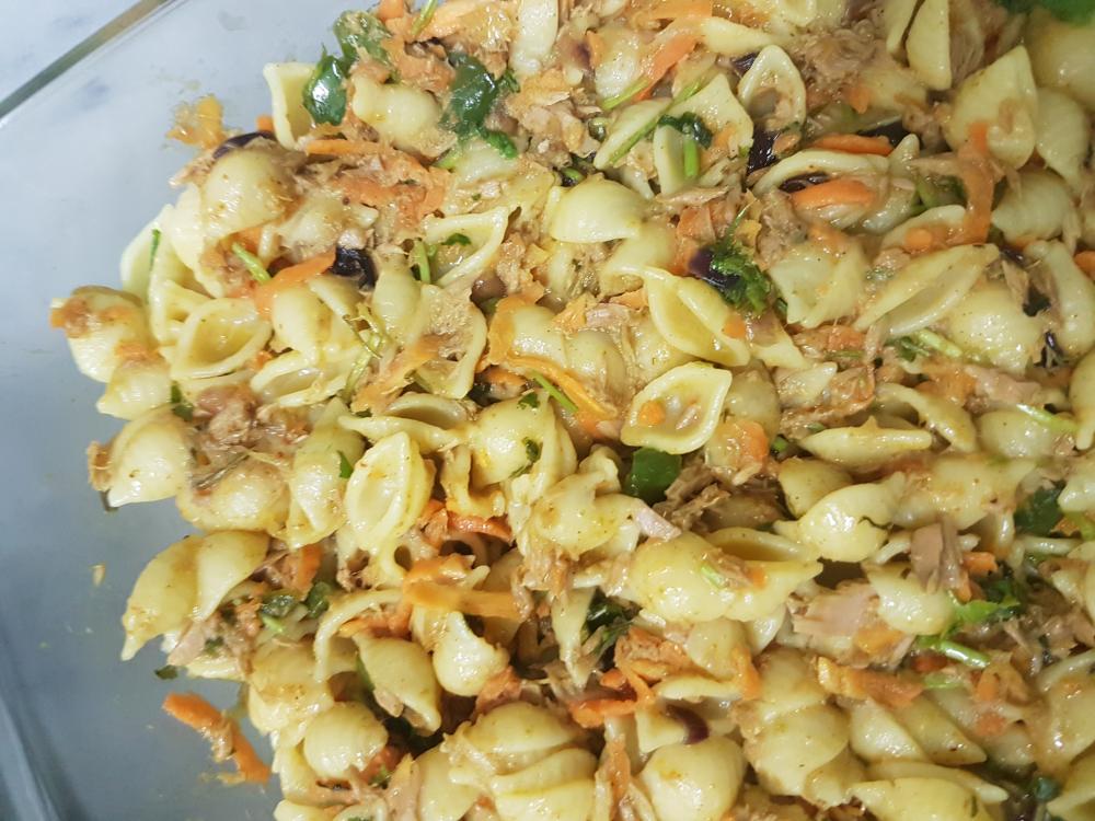 المهم اول شي سلقت المكرونه حطيت مويه وملح لمن غلت واضفت لها المكرونه وصبيت فوقها ملعقه بهارات حاره وقرن فلفل أخضر حار وخليتها استوت وفي هالوقت سويت التونه بطريقة ام عبودي بس ماضفت صلصله اللي هو أول شي كشنت البصل والثوم مع الزيت لين تشقرت بعدها اضفت الفلفل الرومي البارد وحطيت عليه بهارات مشكله مهران وكمون مطحون وذرة ملح على حسب رغبتكم انا ماحب الملح مره بعدها صفيت التونه من الزيت وصبيتها فوق الكشنه وقلبتهم مع بعض وقطعت كزبره خضراء حطيتها على التونه وقفلت النار واضفت لهم جزر مبشور بعدين