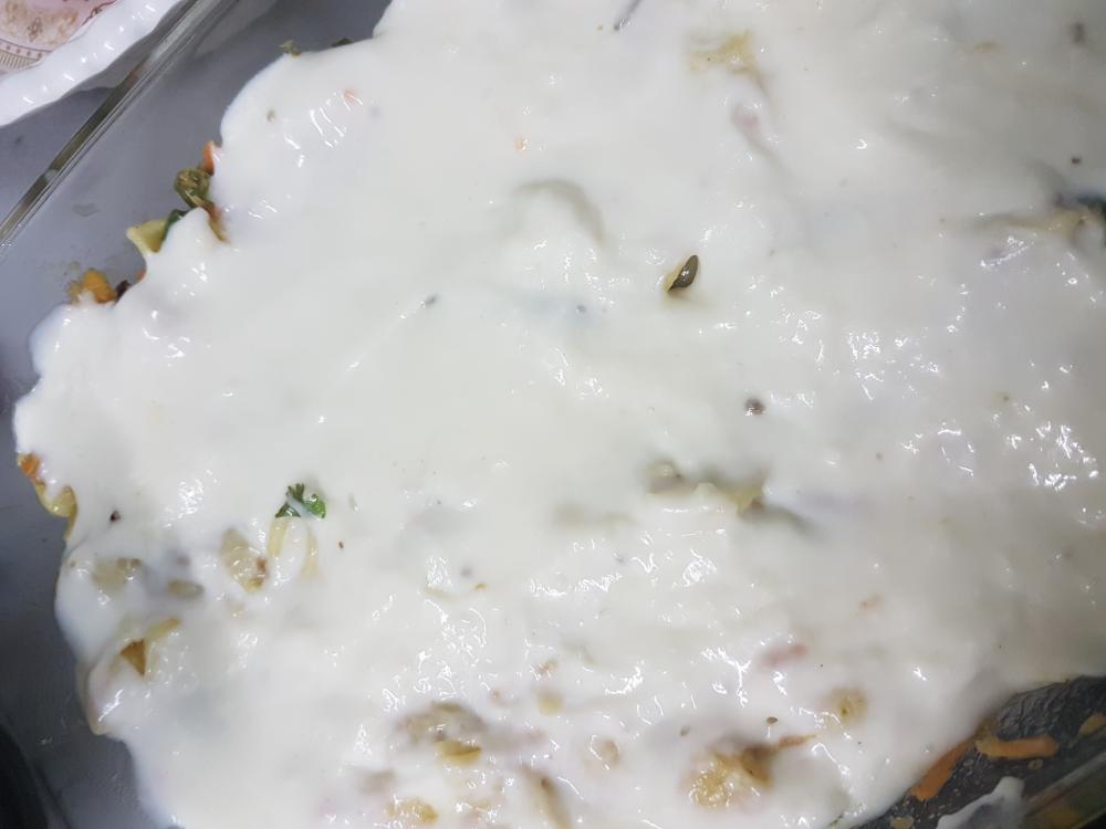 وهذا الوقت كنت قاعده اسوي البشاميل اخذت طريقته من هنا عالم حواء ولذيذ اللي هو حطيت كوبين مويه و٤ ملاعق حليب بودره و ٤ ملاعق دقيق ابيض ورشة ملح وانتبهي اخلطيهم بأستمرار عشان مايتكتل عليك ولمن ينجح طفي النار واضيفي ملعقتن كبار جبن سايل ورشة فلفل اسود