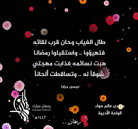 حفظكم الله جميعاً وجزاكم الله خيراً حنين ، نون ، سمر ،محبة ، ريحان .. والغائبين جميعاً وأسماؤهم مكتوبة في القلب .. ذاكرتي مشتتة .. والحمد لله اليوم أحسن .. وأجمل شكري هنا لكل الغاليات المشاركات .، لاعدمنا الحضور الجميل وبكم نستمر وهذا المتسع، ونكون بخير .. حفظ الله الجميع ، ويسر اموركم وعافاكم ، وبلغنا وإياكم شهر رمضان ونحن بخير وعافيه ووفقنا لصيامه وقيامه ونحن بفضل الله ورعايته في صحة وسلامة وجميع من نحب كل المحبة لكم ♥️وكل التقدير 💐🙂حفظكم الله جميعاً وجزاكم الله خيراً حنين ، نون ، سمر ،محبة ، ريحان .. والغائبين جميعاً وأسماؤهم...