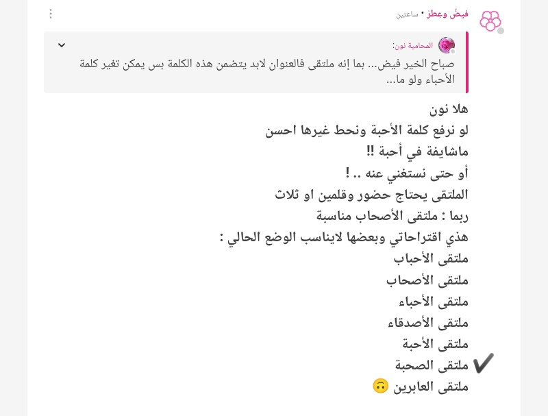 بالنسبة لي أنا اقترح : العنوان : ملتقى الأحبة أو ملتقى الأحباء كالعادة .. والمضمون : مشاركات حرة كالعادة .. جزاك الله خيراً 💐بالنسبة لي أنا اقترح : العنوان : ملتقى الأحبة أو ملتقى الأحباء كالعادة .. والمضمون : مشاركات...