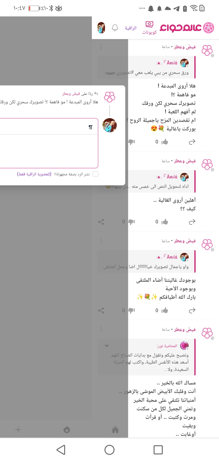 مساؤك عطر فيضنا الغالية ومساء أحبتي في الله واخوات قلبي فتيات الواحة الجميلات نون وريحان واخت المحبة وكل الجميلات اللاتي يسعدني التعرف عليهن هنا مساء جميل ومرحبا بالمنتدى الجديد ان شاء الله نملؤه حب ومودة وتبادل السؤال والمعرفة كما اعتدنا تحياتي يا غالياتمساؤك عطر فيضنا الغالية ومساء أحبتي في الله واخوات قلبي فتيات الواحة الجميلات نون وريحان واخت...