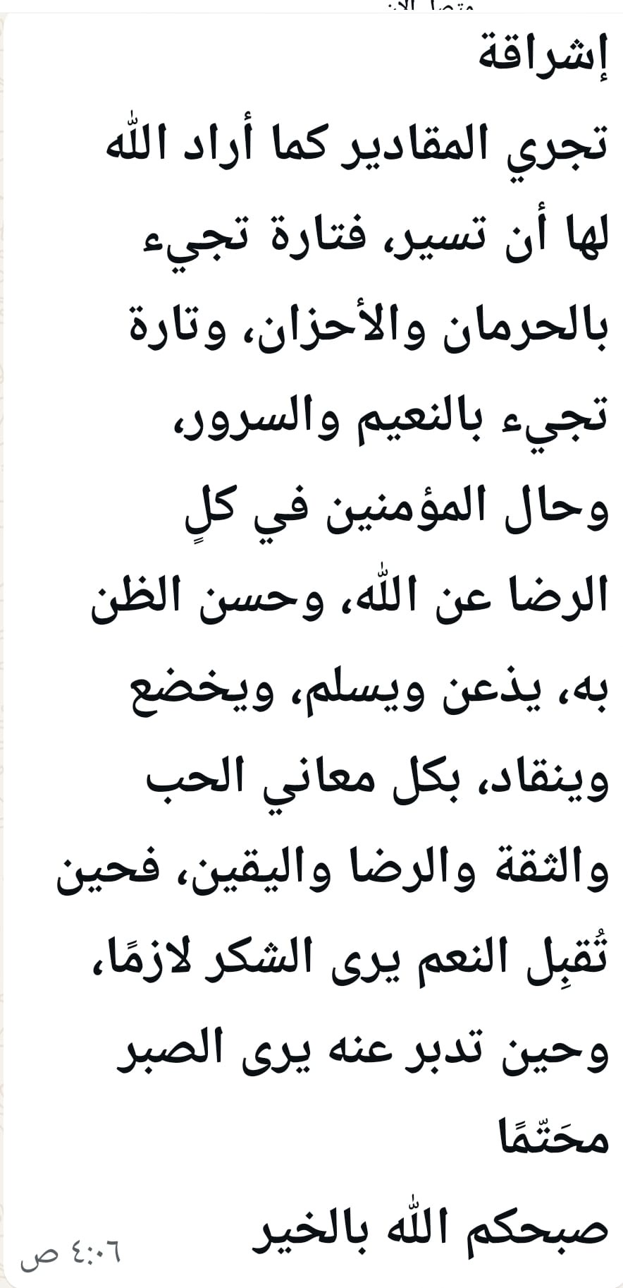 أصبَحنا بنِعمة اللَّه مُتنعمين، وبفضله ورحمته هانئين، اللهُمَّ صباح بُشرى تطرق أسماعنا، وفرحة تغمر قلوبنا، وطمأنينة نعيش بها أيامنا