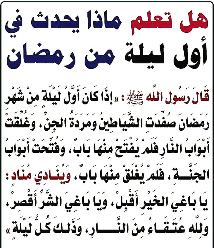 ثبت في سنن الترمذي وغيره عن النبي صلى الله عليه وسلم قال : « إِذَا كَانَ أَوَّلُ لَيْلَةٍ مِنْ شَهْرِ رَمَضَانَ صُفِّدَتْ الشَّيَاطِينُ وَمَرَدَةُ الْجِنِّ وَغُلِّقَتْ أَبْوَابُ النَّارِ فَلَمْ يُفْتَحْ مِنْهَا بَابٌ وَفُتِّحَتْ أَبْوَابُ الْجَنَّةِ فَلَمْ يُغْلَقْ مِنْهَا بَابٌ وَيُنَادِي مُنَادٍ يَا بَاغِيَ الْخَيْرِ أَقْبِلْ وَيَا بَاغِيَ الشَّرِّ أَقْصِرْ وَلِلَّهِ عُتَقَاءُ مِنْ النَّارِ وَذَلكَ كُلُّ لَيْلَة » .