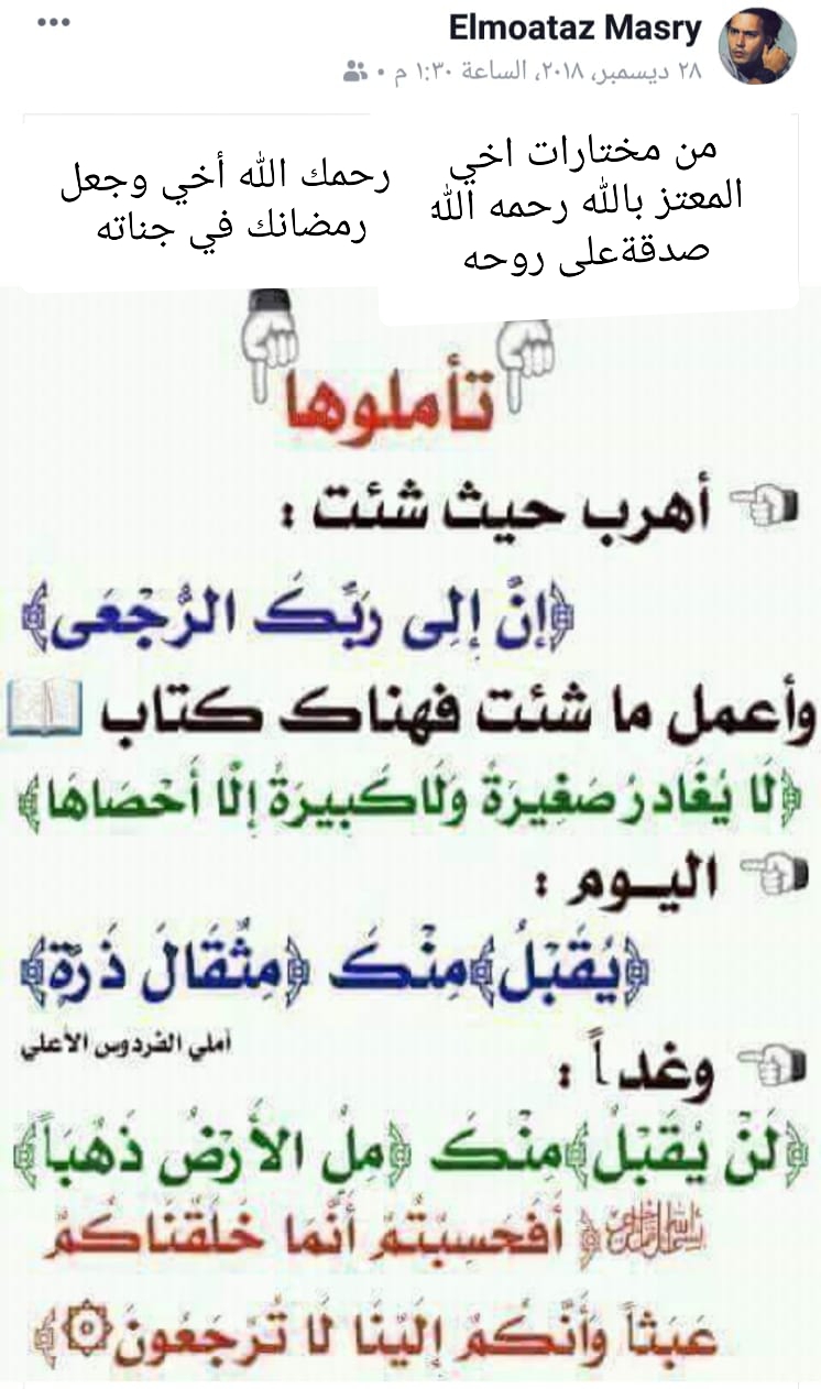 🌺🌺🌺🌺🌺🌺🌺🌺🌺 يَقُول الطَنطاوِي رَحِمَهُ الله: دَرَسْتُ الإِبتِدائِي لأَجلِ المُستَقبَل ثُمَّ دَرَسْتُ المُتَوَسِط لأَجلِ المُستَقبَل ثُمَّ دَرَسْتُ الثَّانَوي لأَجلِ المُستَقبَل ثُمَّ دَرَسْتُ الباكالوريوس لأَجلِ المُستَقبَل ثُمَّ تَوَظَفتُ لأَجلِ المُستَقبَل ثُمَّ تَزَوَجتُ لأَجلِ المُستَقبَل ثمَّ أَنْجَبتُ لأَجلِ المُستَقبَل وَها أنا اليَوم أَكتُبُ هَذا المَقال وَعُمري 77 عاماً وَلازِلتُ أَنتَظِرُ هذا المُستَقبَل.. المُستَقبَل ما هُوَ إِلا خِرقَةٌ حَمراء وُضِعَت عَلى رَأسِ ثَورٍ يَلحَقُ بِها وَلَن يَصِلَها؛ لأَنَّ المُسْتَقبَل إِذا وَصَلتَ إِلَيه أَصبَحَ حاضِراً والحَاضِر يُصبِح ماضِياً ثُمَّ تَستَقبِل مُستَقبَلاً جَديداً... إِنَّ المُسْتَقبَل الحَقيقي هوَ أَن تُرضِيَ الله، وَأَن تَنجُوا مِن نارِه، وَتَدخُلَ جَنته ..! 🌺🌺🌺🌺🌺🌺🌺🌺🌺🌺🌺🌺🌺🌺🌺🌺🌺🌺 يَقُول الطَنطاوِي رَحِمَهُ الله: دَرَسْتُ الإِبتِدائِي لأَجلِ المُستَقبَل ثُمَّ...