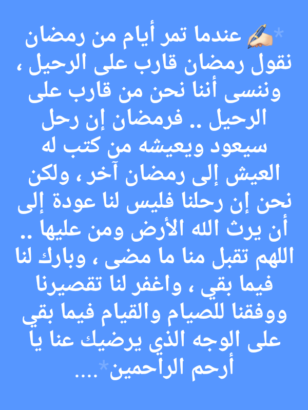 اللهم تمم لها شهر رمضان وهي في صحة وعافية وأن تشفي مريضها وتهدي ذريتها وترحم ميتها وتصلح حالها وأن ترزقها الجنة من غير حساب ولاسابق عذاب