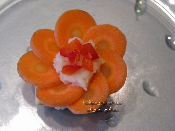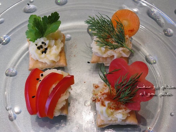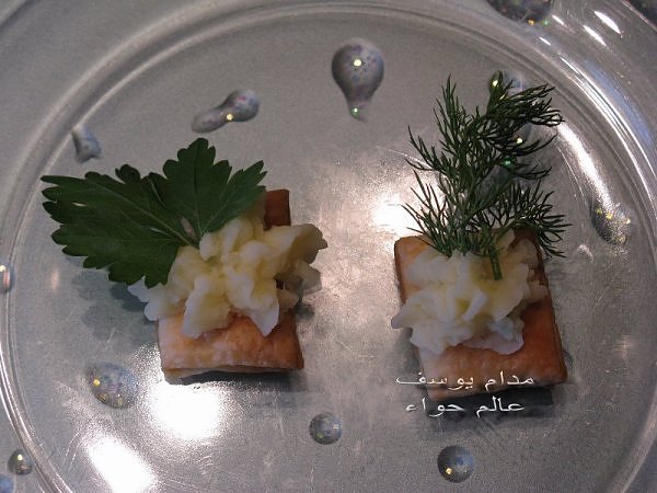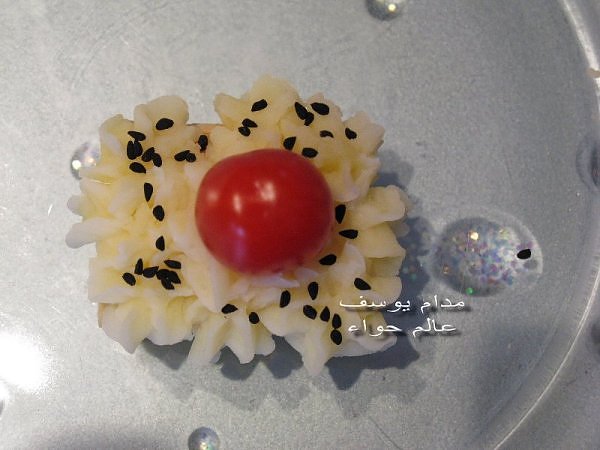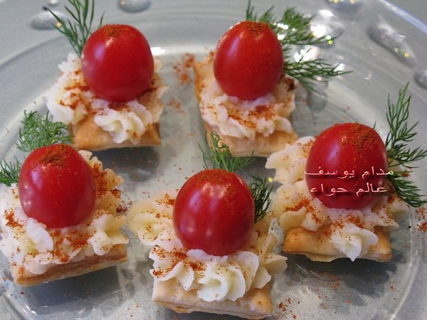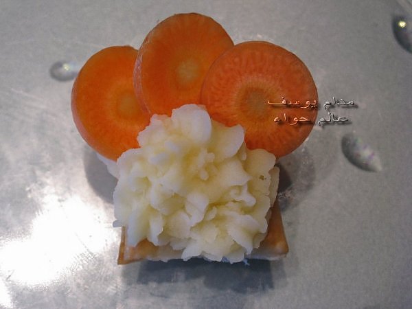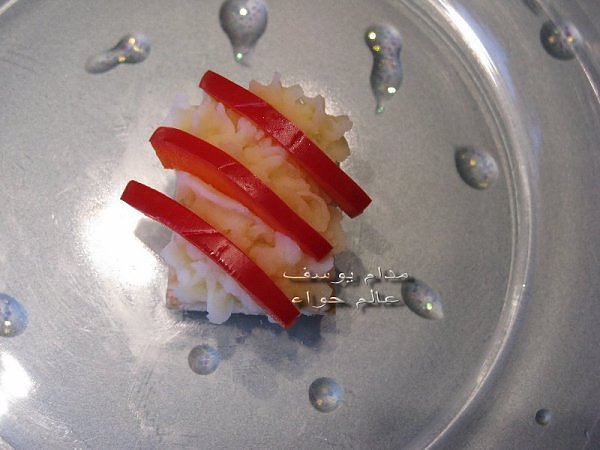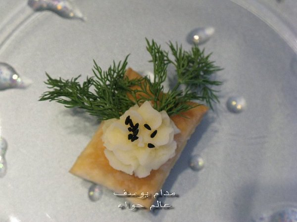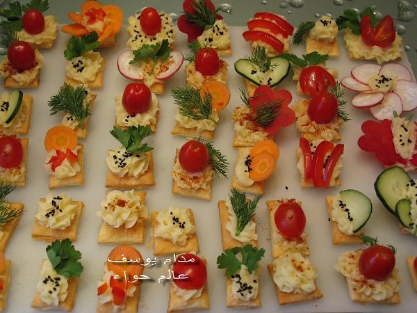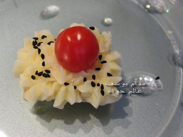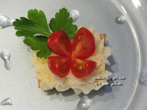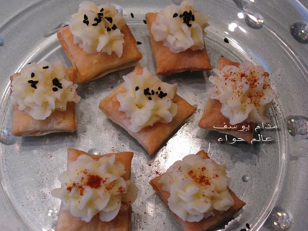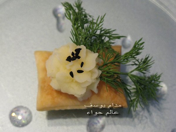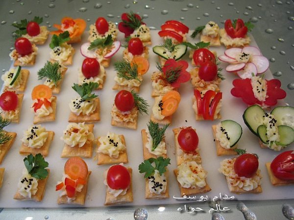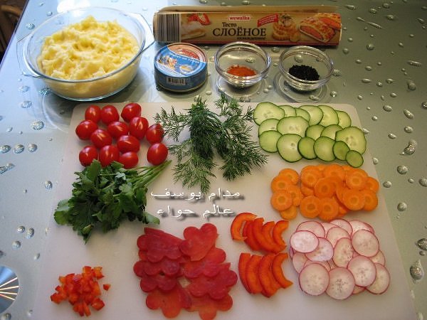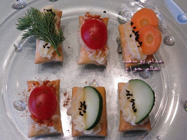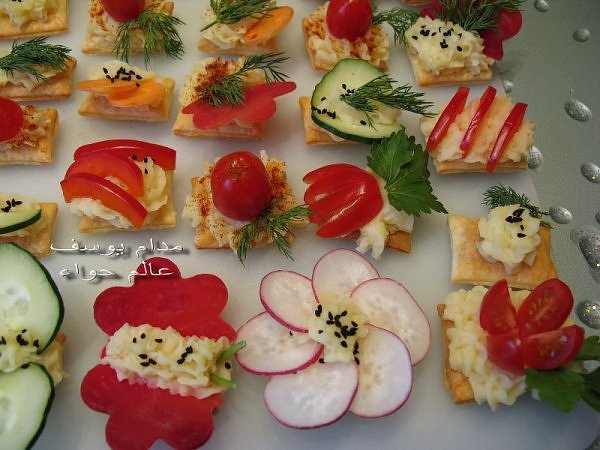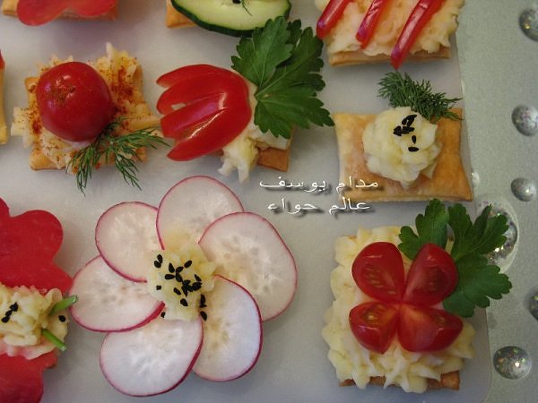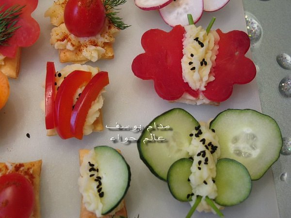 بسم الله *^*^* ما شاء الله بسم الله الرحمن الرحيم ((يَا أَيُّهَا الَّذِينَ آمَنُواْ كُلُواْ مِن طَيِّبَاتِ مَا رَزَقْنَاكُمْ وَاشْكُرُواْ لِلّهِ إِن كُنتُمْ إِيَّاهُ تَعْبُدُونَ )) سورة البقرة : 172 ( يَا بَنِي آدَمَ خُذُواْ زِينَتَكُمْ عِندَ كُلِّ مَسْجِدٍ وكُلُواْ وَاشْرَبُواْ وَلاَ تُسْرِفُواْ إِنَّهُ لاَ يُحِبُّ الْمُسْرِفِينَ ) سورة الأعراف : 31 ------- السلام عليكم و رحمة الله و بركاته النهارده ان شاء الله هانبدأ بحاجة بسيطة و تقريبا كلكم بتحبوها و هي البف باستري هانعمل منه نوع من المقبلات بسيط و خفيف مع طرق تزين جميلة بسم الله نبدأ المقادير عجينة بف جاهزة ( ممكن استبدلها بالتوست ) - خيار - حبة البركة - شطة بودرة طماطم تشيري - شبت - بقدونس شرائح من البنجر المسلوق - شرائح طولية من الفلفل الرومي بطاطس مسلوقة ومهروسة ( او معجون تونه كابديل ) طريقة البطاطس ( اسلقيها و اهرسيها مع القليل من اللبن و الملح و الفلفل او اي بهار تفضلونه - لابد ان تكون البطاطس كالكريمة المتماسكة حتي يسهل استعملها في التزين ) الطريقة احضري العجينة وابدأي بقطعها بالطول ثم بالعرض - لعمل مربعات ادخليها الفرن المسخن مسبقا علي درجة حرارة 180 لحين النضوج جهزي البطاطس يتبعبسم الله *^*^* ما شاء الله بسم الله الرحمن الرحيم ((يَا أَيُّهَا الَّذِينَ آمَنُواْ...