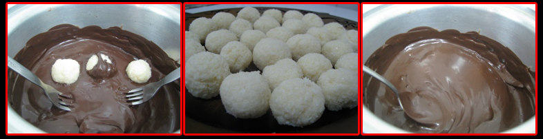 3- تذاب الشوكولاته في حمام مائي ثم تغطى اصابع جوز الهند كلياً .. وتوضع على على ورق زبده ..