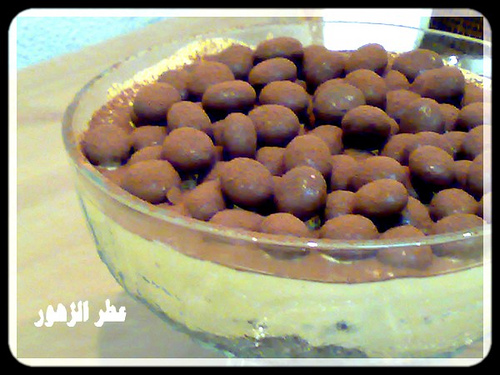 3- نصف على الوجه حبات الشيكولاته ( المالتيزر ) وثم نرش الوجه بالكاكاو الباودر ..