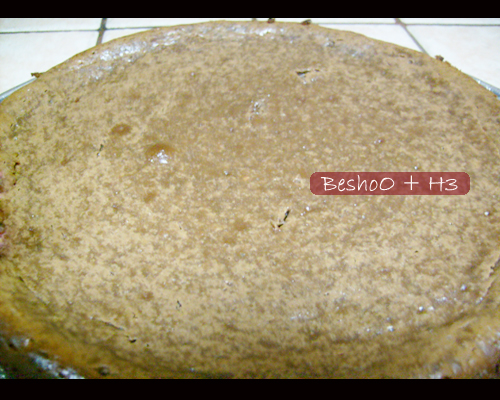 يصب الخليط في صينيه متوسطه تميل لـ الصغيره ويساوى السطح