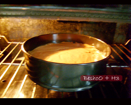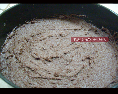 5-نصب الخليط في القالب (المدهون بالزبدة كويس والمرشوش دقيق بسخاء وندخله الفرن في الرف الاوسط وبتاخذ لها تقريبا من 35 دقيقه ل 45 دقيقة يعتمد على حرارة الفرن...