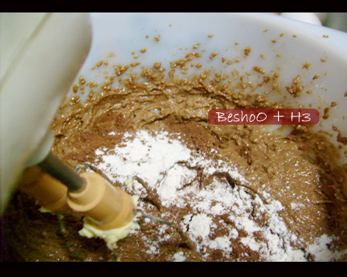 بعدها نضيف الدقيق والشوكولا بالتدريج الى ان يتكون لدينا خليط اثقل من خليط الكيك