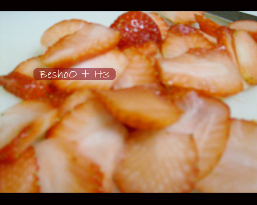3ـ تقطع شرايح من كيك الجااهز وترتب في قااع طبق التقديم..ثم يضاف نصف مقدار