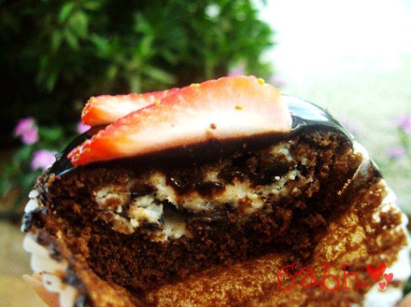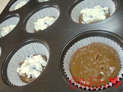 في اوراق الكب كيك حطي شوي من خليط الكيك بعدين الحشوه بعدين غطيها بطبقه من الكيك ..