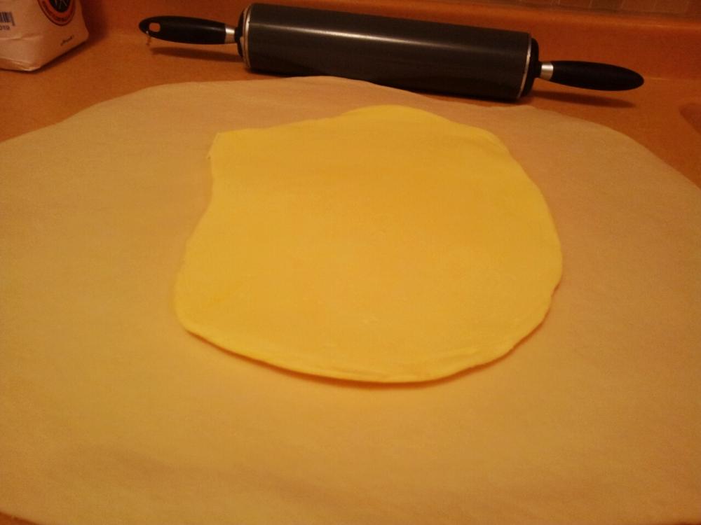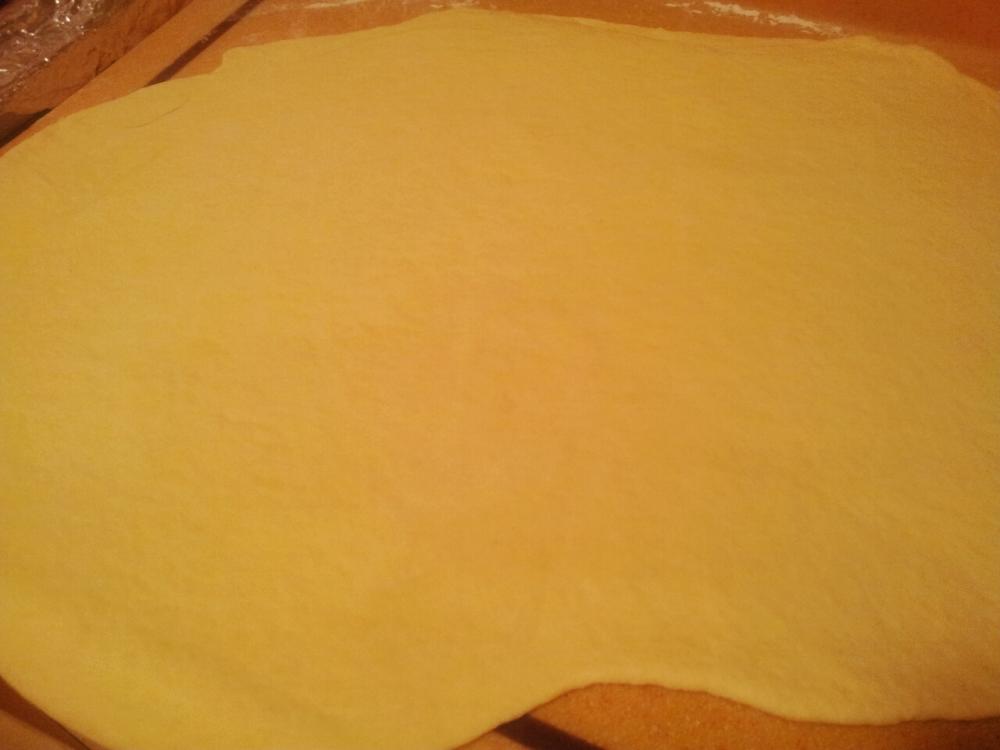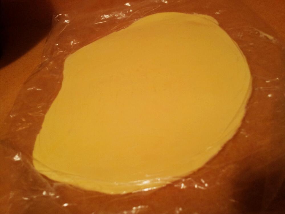 نفرد العجينة واحد سم ونطلع الزبدة من النايلون ونحطها بوسط العجينة اللي فردناها